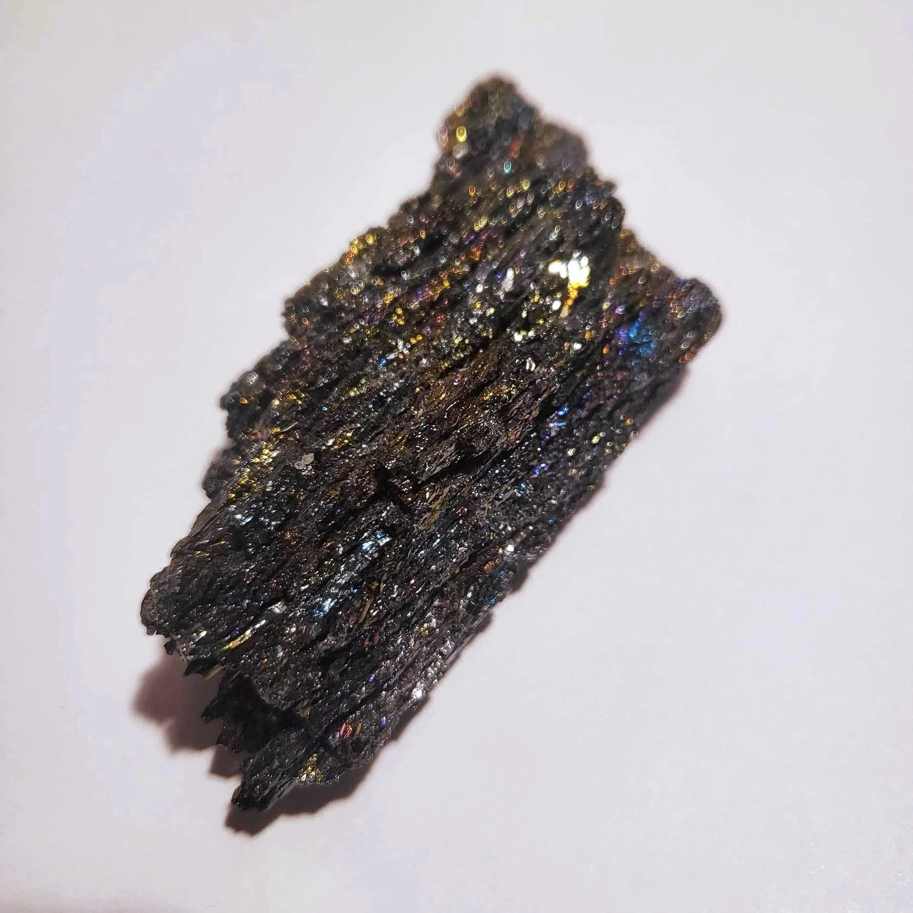 This crystal is often mistakenly referred to as Rainbow Hematite (an Iron oxide) due to its colorful appearance. Cardorundum is actually lab-made Silicon carbide and widely used as an abrasive in manufacturing due to its durability and low cost. When I went to research more about it, I was shocked to see just how many practical uses it has and how many different goods it’s used to make. As an artist, I was particularly interested in the fact that it’s used for art practices such as printmaking and drawing. I recommend reading up on Carborundum mezzotint, a form of printmaking that was popularized in the 1930s in Philly, PA by artists like Dox Thrash if you’re interested. Originally used to grind down lithography stones, Carborundum is used today to create gradients and sandy texture in prints. It’s also used in the manufacturing of graphite pencils. So not only is it a beautiful crystal to look at, it’s a pretty practical one too. Although most Carborundum is lab-made, it is found in low quantities in meteors when naturally occurring. Another name for Carborundum is Moissanite when cut in a gem formation and it’s frequently used in jewelry (a great substitute for diamonds too!)